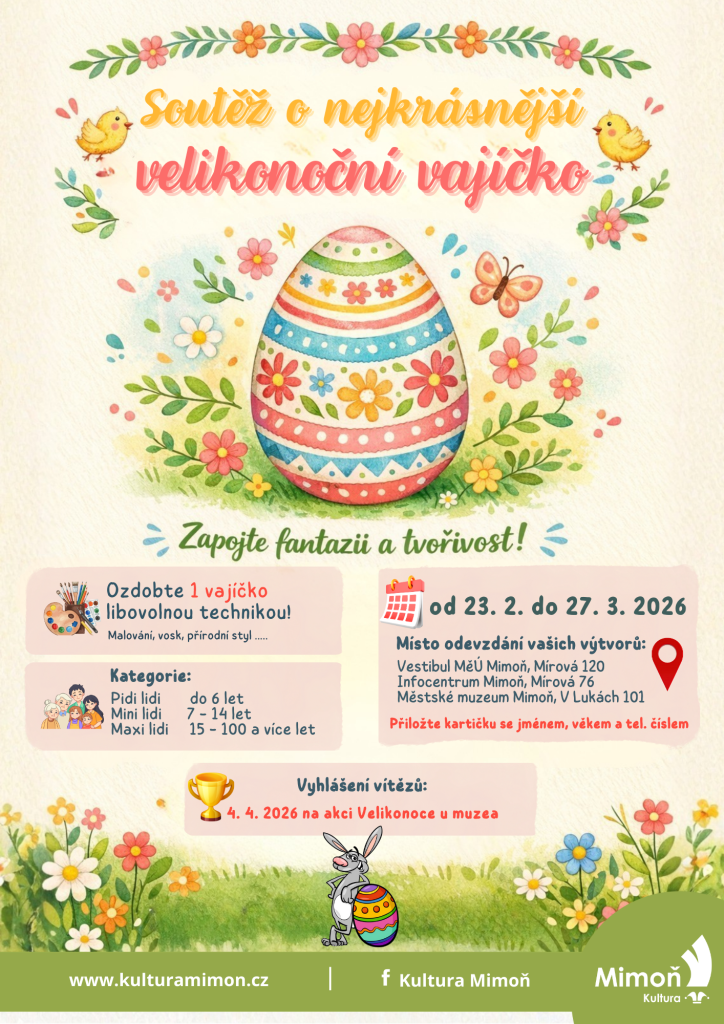 Tak jako každý rok vyhlašujeme výtvarnou soutěž o nejkrásnější velikonoční vajíčko a zveme všechny malé i velké umělce, aby ukázali svůj talent.