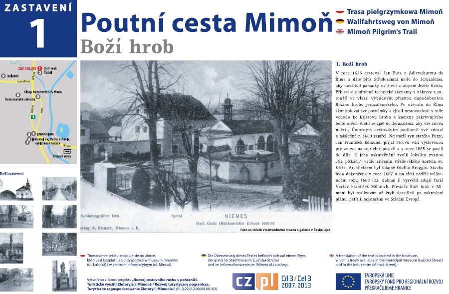 Jsou místa na pohled obyčejná, ba i docela nezajímavá. Někde tam se však nalézá věkem zasutá minulost tvořící pravý duchovní cyklus, který můžeme znovu objevovat. Mimoňský Boží hrob je místem dvou protikladných a vzájemně se protínajících představ, smrti a vzkříšení. Odtud cesta vychází a tady také končí. Míří k symbolům mariánské úcty, vyjadřujícím tradiční lásku lidu. Kolem galerie soch světců kráčí poutník k chrámu zasvěcenému apoštolským knížatům sv. Petru a sv. Pavlovi. Po symbolickém zastavení u Getsemantské zahrady pokračuje přes Kalvárii zpět k Božímu hrobu jako místu Vzkříšení. Okruh v délce cca 2 km ukáže putujícímu bohatost a krásu místní barokní architektury a snad ho i přiměje na jednotlivých zastávkách ke krátkému duchovnímu rozjímání.